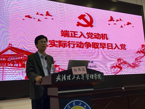 管理学院杨伟波副书记以“端正入党动机,以实际行动争取早日入党”为主题,通过回顾党的历史,解读党的性质与宗旨,明确党员权利和义务,对入党积极分子提出要求,端正入党动机、坚定远大理想、加强理论学习、从身边点滴做起,以实际行动争取早日加入党组织。