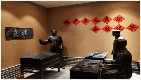 襄阳活动厅这幅图主要讲述了萧楚女在省立二师领导学生运动。当时的二师是鄂西北的最高学府,崇尚封建、礼教。萧楚女来后给学校带来了清新的革命气息,他敢于向陈规陋习挑战,倡导教学改革,开设新文化课和口语课,向学生传播反帝反封建的革命思想,并带领学生积极参加社会活动。萧楚女第二次来“二师”后,专门讲新文学,自己编写讲义,不再担任物理和哲学课程教员。他提出学生自治的口号,说:“学校是属于学生的学校的教学和一切设施,都应以学生为主、为学生设想”,萧楚女这次来“二师”和以前大不一样,这时已是一名共产党员,在政治上更加成熟的他直接向学生宣传马克思主义。主张用马克思主义观点考察中国问题,改造社会,改造中国,启发学生的思想觉悟,激起青年人追求革命真理的热情 。