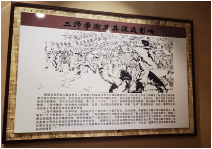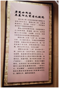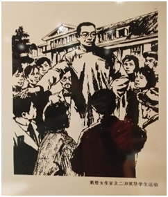 左边宽大的横幅记录了萧楚女一生的革命轨迹。右边这副巨幅油画反映的主要内容就是当年震惊鄂北的“二师学潮”的情景。二师学潮的影响是巨大的,他沉痛的打击了鄂西北的封建势力,为鄂西北今后的革命发展起到了关键性的作用。