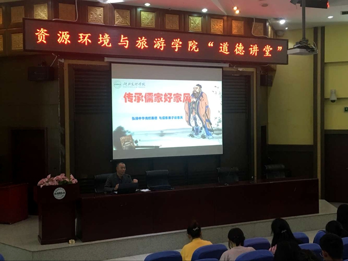 (资源环境与旅游学院 通讯员 王欢) 近期,学校道德讲堂系列活动持续举行。10月18日晚,由资环学院承办的以“传承儒家好家风”为主题的道德讲堂在致远楼一楼报告厅举行。资环学院全体学生干部及18级学生参加活动。