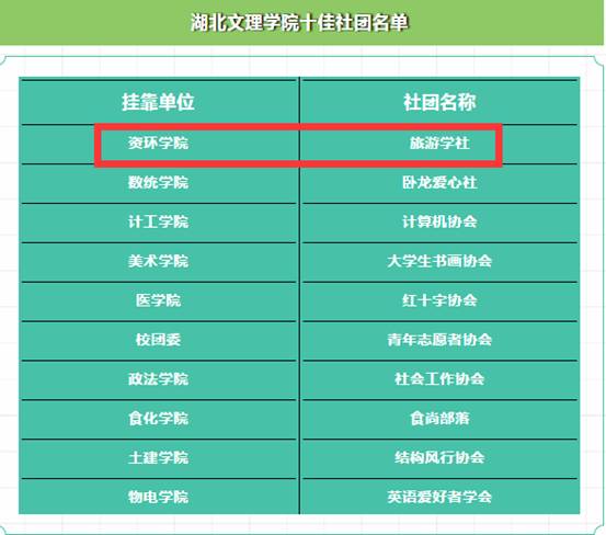 (资源环境与旅游学院 通讯员 黄志毅)近日,从共青团湖北文理学院委员会及社团联合会获悉,资源环境与旅游学院 旅游学社经过申报、推荐、审查,最终荣获“十佳社团”称号。