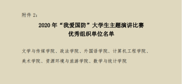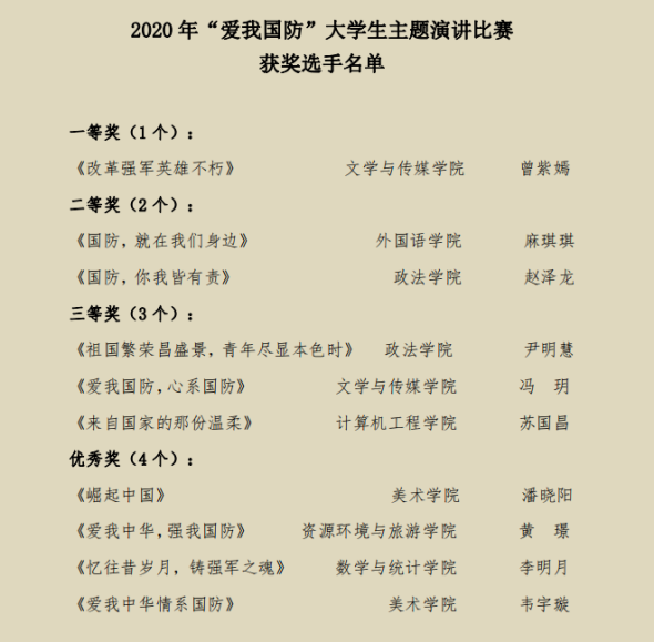(资源环境与旅游学院 通讯员 黄璟 审稿人 李宇)11月12日,学工处公布了2020 年“我爱国防”大学生主题演讲