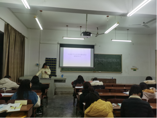 团课伊始,组织委员兼副团支书肖倩栖向同学们介绍了《习近平与大学生朋友们》。随后,肖倩栖播放了一段关于此书出版的新闻视频,展现出社会对这本书的热烈反响。紧接着,肖倩栖介绍了习近平总书记在多所高校进行考察,与许多大学生亲密接触,友好交谈的故事,并展示了一些总书记同大学生及青年朋友们亲切交谈的照片。“志存高远、脚踏实地、行循自然”,这是习近平总书记给我们的寄语;“把中华优秀传统文化传播到五湖四海”,这是习近平总书记对我们的勉励。