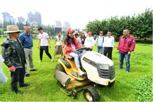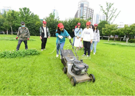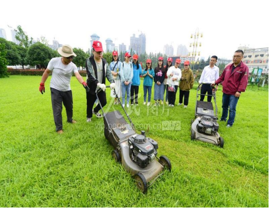 2021年5月25日,湖北襄阳,大学生在园艺技师的指导下体验修剪草坪。