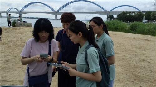 为了解城市湿地的发展历程,团队于23日上午来到汉水之滨:月亮湾公园。园内风景优美,景观独特,既具有现代园林特色,又富有田园风光和自然野趣闲情,有野趣游赏,水上活动等十一个各具特色的功能分区。队员们来此观赏多样生物,学习河流保护知识,开展河流巡护等实践活动。