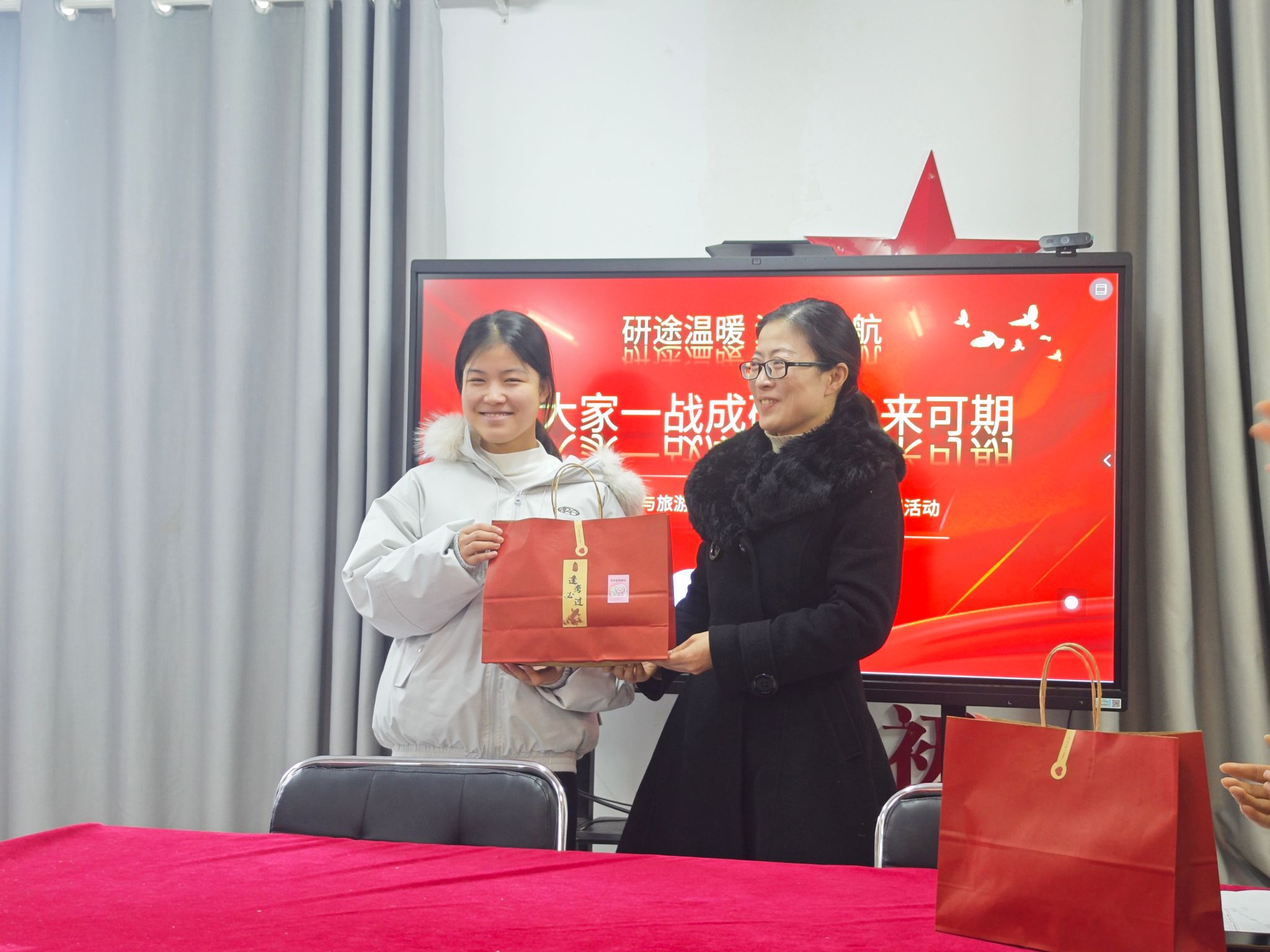 活动伊始,黄文为同学们送上暖心慰问与殷切嘱托,她细致询问大家的复习进度、备考状态和生活需求,叮嘱同学们既要铆足干劲、科学规划复习节奏,也要劳逸结合、注意保暖和身心健康;龙雨萍结合自身求学与成长的经历,以亲切质朴的话语为大家疏导压力。她叮嘱同学们不必过度焦虑,要学会放平心态、张弛有度,从容应考;李权国结合学院往年考研数据展开深入分析,从报考趋势、录取情况等方面为学子们梳理备考思路,帮助大家明晰方向、坚定信心;郭超详细介绍了学院地理专业硕士点的学科特色、培养优势及招生情况,为有意向报考本院硕士点的学子提供了精准指引。分享交流环节气氛热烈,旅游管理2212班金安若结合自身备考经历,分享了时间规划、科目复习的实用技巧;地理科学2211班杨烁则从心态调整、备考感悟出发,与大家交流了冲刺阶段的注意事项。在场考研学子们畅所欲言,纷纷诉说自己的备考感悟与复习困惑,现场互动频繁,暖意融融。最后暖心环节中,毕业生辅导员李雨萌为考研同学们逐一解读考研慰问大礼包里的礼品寓意。一支笔,寄托着“笔下生花、妙笔生辉”的期许;一片暖宝宝,愿大家“手心温暖、思路滚烫”;一块士力架,助力学子们扛过冲刺阶段的疲惫;一包上好佳,寓意“落笔从容、逢题‘上好’”;一罐旺仔牛奶,祝大家考试“旺旺”开挂;一罐幸运抽签饼干,更是承载着“一战成硕”的美好祝愿!至此,活动圆满结束。