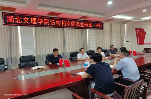 (资环学院 通讯员 邓洁屹) 5月27日,学校党委副书记王为一带队到南漳县开展访企拓岗活动。王书记一行先后走访了南漳县第一中学、南漳龙蟒磷制品有限责任公司和湖北楚天传媒珍珠液酒业有限公司,并与学校、企业负责人进行了座谈交流。
