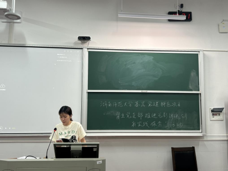 活动伊始,党支部第一书记刘库老师作开场致辞。他指出,本次红色主题影视作品观摩讨论会是党支部主持的湖南师范大学基层党建特色项目“学生党支部推进'光影铸魂'创新实践探索”的重要实践内容之一。希望大家大家认真观摩、积极发言,通过影视作品和文字作品的形式,将党的光辉历程、英雄事迹、理论思想等深入浅出地呈现给广大党员群众,在观摩红色主题影视作品时,深刻感受党的旺盛生命力与强大战斗力,把握党的人民性、先进性与纯洁性。