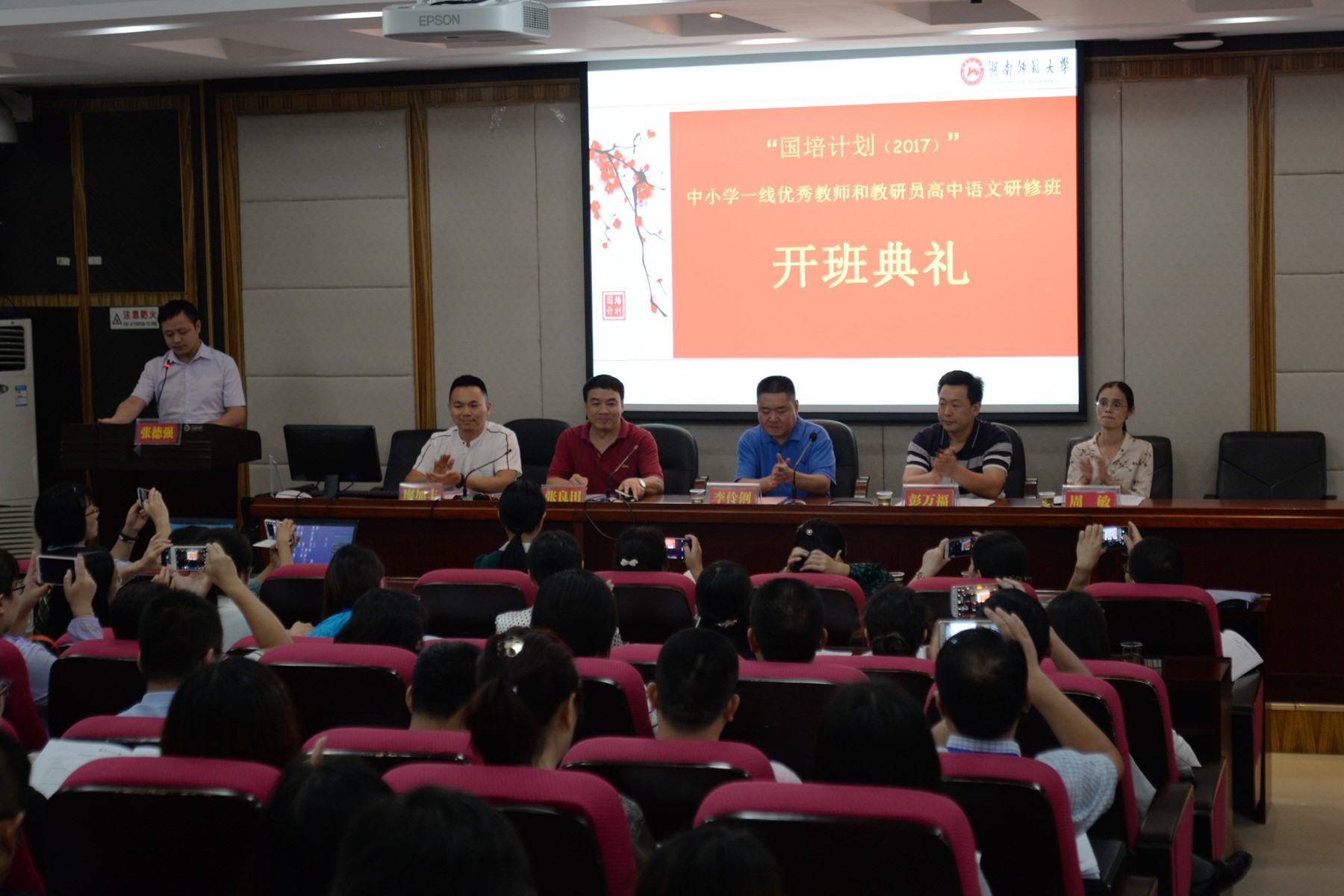 (通讯员:何烨)9月11日上午,国培计划(2017)——中小学一线优秀教师和教研员高中语文研修班开班典礼在文学院216举行。出席开班典礼的有湖南师范大学文学院党委李伶俐书记、彭万福副院长、张良田教授、周敏副教授以及培训班班主任廖加丰老师。开班典礼由文学院成教办张德强主任主持。