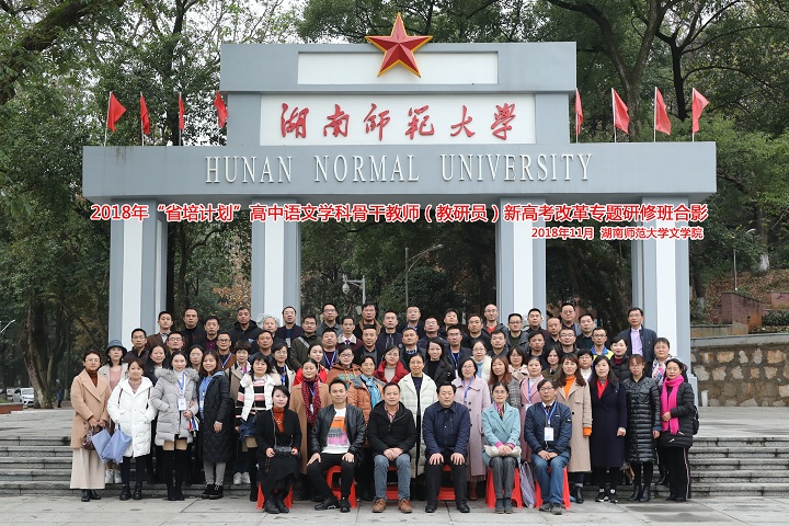 开班仪式之前,全体人员观看了湖南师大八十周年校庆宣传片并合影留念。此次研修班将在我校学习九天,期间将赴湖南师大附属中学、长沙市一中、长沙市明德中学访学交流。来自全省14个地州市的70名高中语文骨干教师(教研员)参加研修班学习。