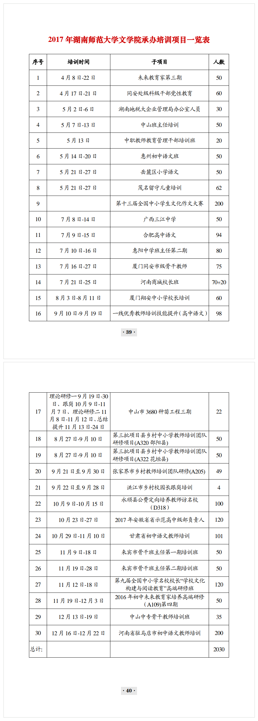 2017年文学院承办培训项目一览表