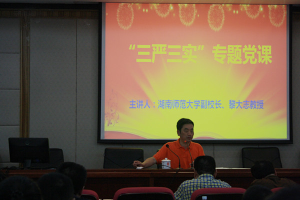 (通讯员胡媛媛郑璐佳)6月16日下午,副校长黎大志到文学院216学术报告厅主讲“三严三实”专题党课。校监察处处长兼“三严三实”专题教育第一督导组组长王先酉担任主持。