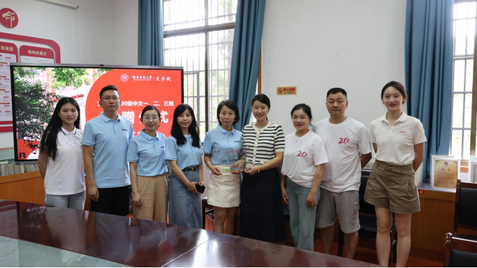 为更好促进大学生的心理健康和成长发展,2000级中文一、二、三班校友共同决定,为学院“心晴”特色成长辅导室捐赠相应设备和物资。学院党委副书记刘宓蜜感谢校友们对学院发展的大爱支持,并介绍了学校和文学院近年发展情况,表达对校友的牵挂关怀和诚挚祝福。会后校友们一同参观了学校校史馆,重温当年在母校的记忆。