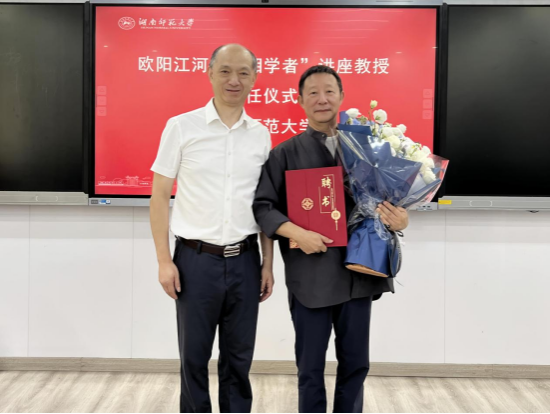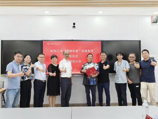 (通讯员李晨玮)9月12日上午,湖南师范大学文学院举行“潇湘学者”讲座教授聘任仪式,著名诗人欧阳江河受聘为我校“潇湘学者”讲座教授。校党委委员、副校长杨震出席,文学院党委书记熊剑峰主持仪式。