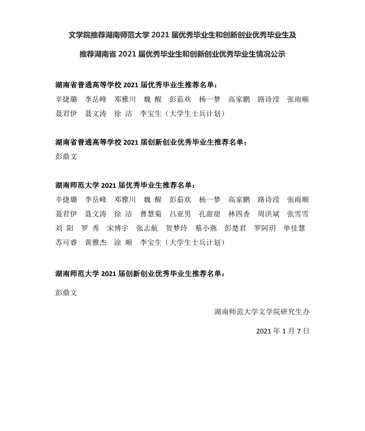文学院推荐2021届优秀毕业生和创新创业优秀毕业生情况公示