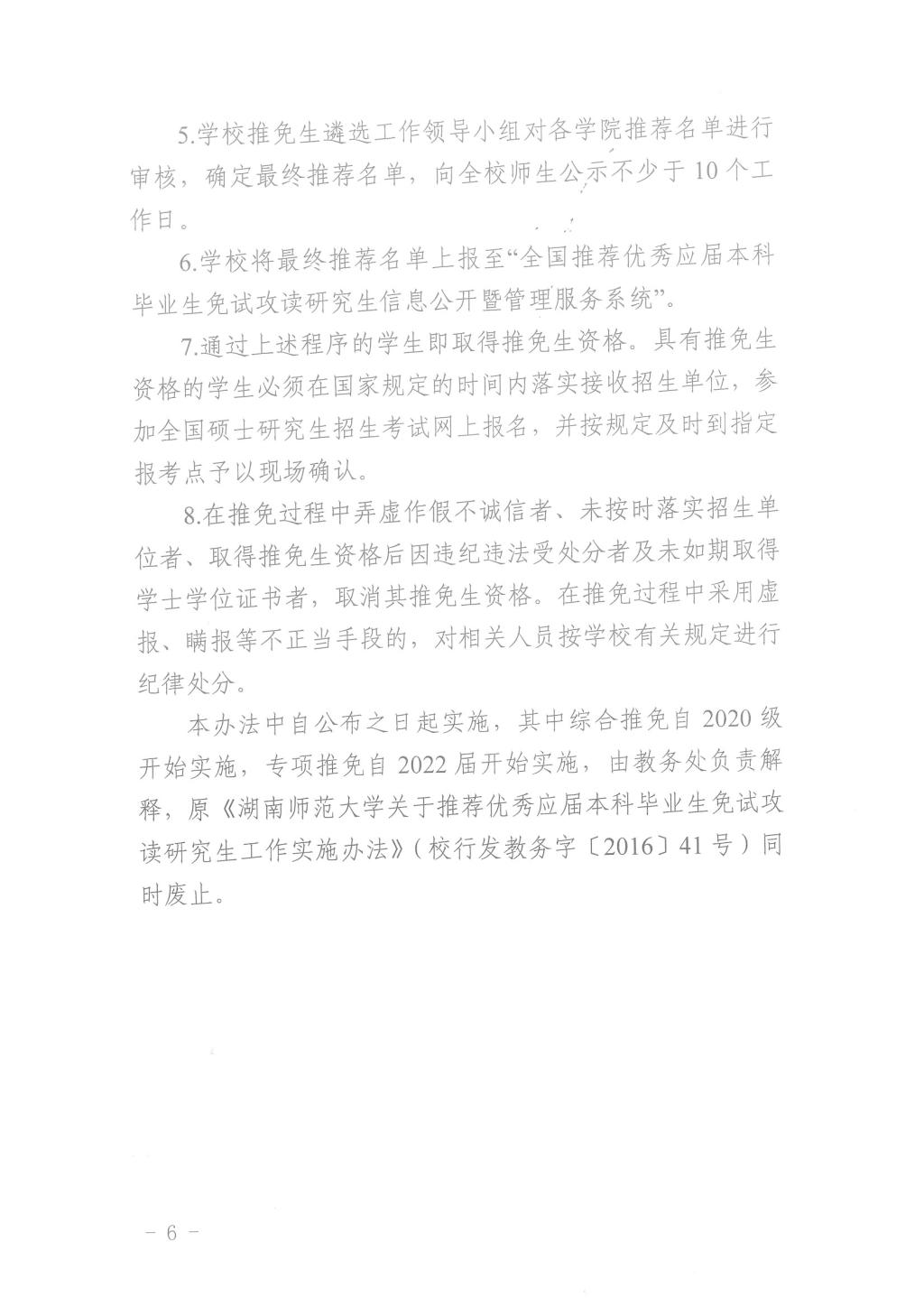 关于印发《湖南师范大学关于推荐优秀应届本科毕业生免试攻读研究生工作实施办法》的通知