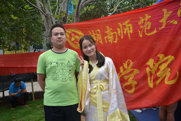 学校领导来到现场视察迎新工作,慰问各单位迎新工作人员,看望新生和家长,并与家长新生一起参与创意迎新活动,观看汉服表演、翻看文学院迎新专刊《号角》、共同品尝鹿鸣茶艺社所沏的毛尖、龙井。