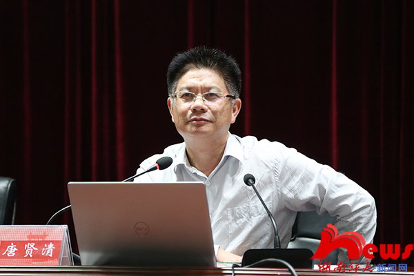 (记者 黄林键 刘书含 通讯员 陈芬芳 姚汀)6月12日晚,校纪委书记唐贤清在国际学术报告厅为文学院2018级学生讲授以“推动共建‘一带一路’走深走实”为主题的“形势与政策”课。讲座由院党委副书记熊剑峰主持。