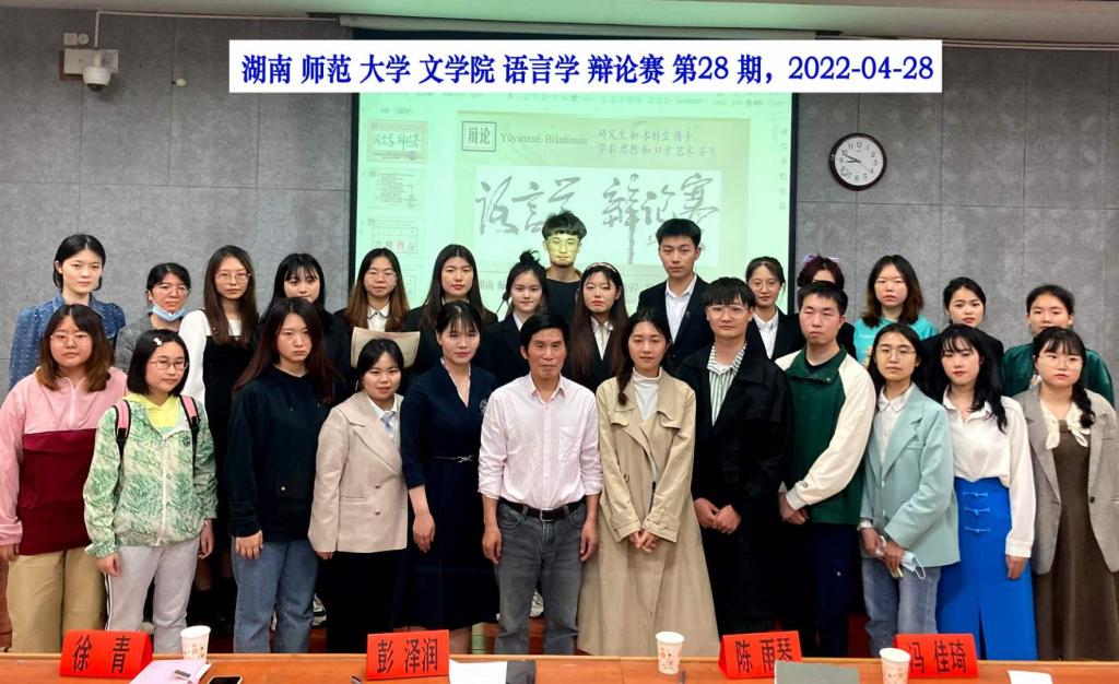 (通讯员:胡湘宇、李思洁、熊杨平安)4月28日下午6点30分,文学院语言学辩论赛第28期在线上腾讯会议和线下217教室同步举行。这是文学院人才培养的品牌活动:“研究生与本科生携手,学术性和思想性齐飞”。2021年级语言学硕士生周雅慧和刘海芳,2020年级基地班和写作班的本科生孙一冉、于作梁、李晴、陈菲菲、周佳芯和陈柳林担任辩手。2020年级基地班本科生王惠论担任主席。彭泽润教授、赵立博老师(线上),博士生徐青,硕士生陈雨琴、冯佳琦担任评委。