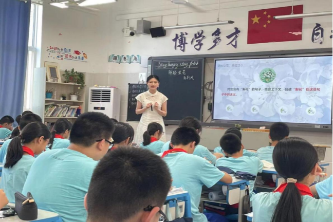 课堂上,谭星瑶以略读与精读相结合的方式,带领学生梳理情节。她还着重分析了文本中描写“梨花”的段落,帮助学生理解“梨花”在文中的多重意蕴。同时她通过资料的补充助读,引导学生们结合作者的创作理念深入探究,得出“梨花”所体现的深刻意蕴是根植于中华民族优秀传统文化的助人为乐的精神。此外,谭星瑶还采用了大单元教学的理念,将本单元的课文与《论语》相联系,帮助学生深入体悟各个文本中的中华优秀传统文化。