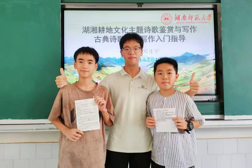 在桃源县木塘垸镇中学,实践团立足耕地文化特色,精心设计课程内容。诗词课上,通过诵读《插秧歌》《观刈麦》等农事诗词,学生们在吟咏中感受“汗滴禾下土”的艰辛与诗意;书法教学中,学生提笔书写有关农耕的成语,墨香里浸润着对土地的敬畏;创意写作课上,师生共同观察物候变化,探讨农具发展历程,最后用文字写下“我与大地的故事”。从诗词到写作,从笔尖到心间,耕读文化的种子悄然生根。