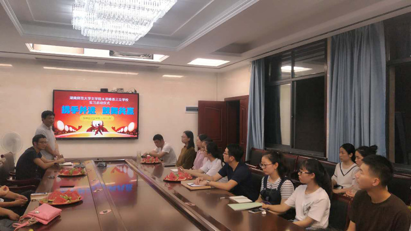 18日晚七点,师大文学院实习队与三立学校在教学楼5楼会议室举行实习启动仪式。贺校长、曹书记、朱校长与各位实习老师出席会议,会议由朱校长主持。贺校长代表三立学校表达了对实习队伍的热烈欢迎,曹书记在讲话中对实习的具体内容作了精心周密的安排,双方就实习细节进行讨论并达成一致认同。