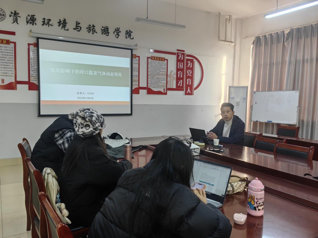 (通讯员:贺睿)2025年12月3日下午,资源环境与旅游学院在N2-331会议室举办研究生“学术节”系列活动。本次活动邀请到刘双圆老师主讲,刘老师以“低氧影响下的河口温室气体动态变化”为题,围绕其研究背景、研究思路、主要成果及未来展望,为在场研究生呈现了一场内容丰富、逻辑清晰、数据翔实的学术报告。交流会由研工办蒋老师主持。