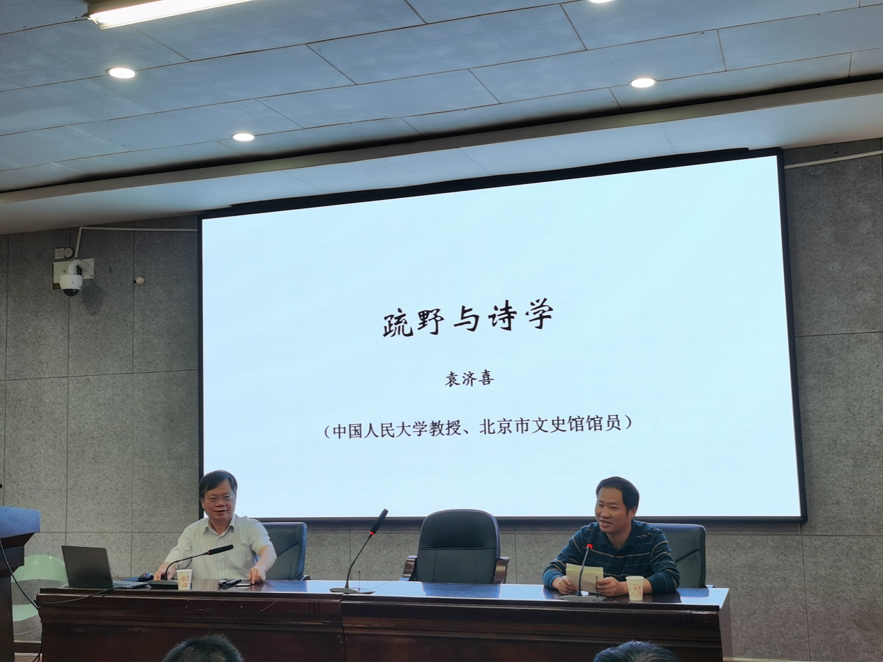 (通讯员方平)9月23日下午三点,中国人民大学杰出学者特聘教授袁济喜老师莅临文学院,在217教室作了题为“疏野与诗学”的精彩讲座。这是文学院“智慧之光”学术名师系列讲座中的又一次学术思想盛宴。本次讲座由汤凌云教授主持,中南大学毛宣国教授,本院周泽东副教授、文浩副教授、牟方磊老师等多名教师和硕博士生参加。