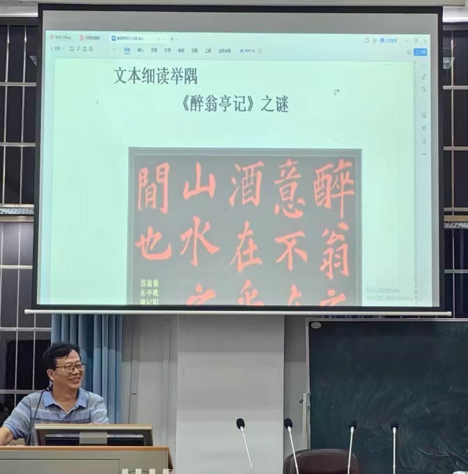 (通讯员高薇钿)5月17日晚,华南师范大学二级教授、博士生导师,中国古代散文学会副会长、广东省珠江学者特聘教授、华南师范大学文学院副院长马茂军教授,应邀在古代文学教研室417开展了题为“文本细读举隅《醉翁亭记》之谜”的精彩讲座。本次讲座由中国古代文学学科带头人蒋振华教授主持,文学院多名教师及众多中国古代文学研究生参加。