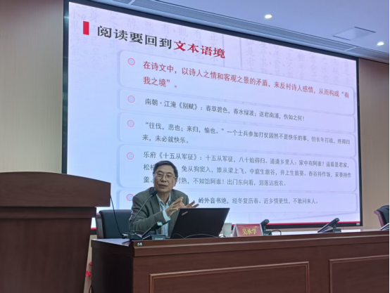 吴承学教授首先介绍了阅读的四个基本要求:第一,读书务先博观;第二,读书须注意文体语境与文体逻辑;第三,读书须置身于具体历史语境;第四,读书要回到文本语境。然后通过援引一些较为常见的文学原典和理论,剖析其中的深意和误区,启发大家在阅读时应当发挥主观能动性,深入辩证地思考。如他对陆机《文赋》“心懔懔以怀霜,志眇眇而临云”进行讨论,有学者认为是写高洁的品格,吴教授结合刘勰、锺嵘和江淹等人的作品,认为“怀霜”指冬天,“临云”指夏天,这样更符合赋体的文体逻辑。他认为读书要善于联想和超越,追求力透纸背,以期能够超越文本,领悟人生,提出“我们需要从中国文化的内在理路、文献史料与原始语境出发,也需要能超越文本之表和惯性思维的悟性与洞察力,读书要有力透纸背的能力。”他还通过对“诗能穷人”“诗能达人”“不值”和“不遇”等话题的深入剖析,挖掘其背后超越世俗、追慕崇高的诗学理想;并以此为契机,希望大家在阅读中、在生活中对过程持一种品赏的态度,带着诗意的眼光,指出读书的境界,其实也是人生的境界。