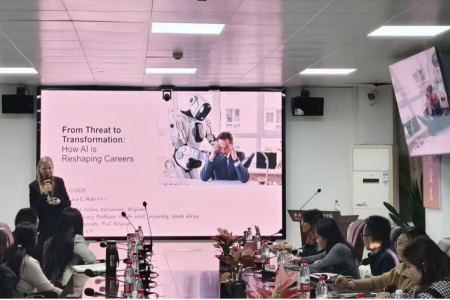 2025 年 10 月 24 日下午,比利时鲁汶大学 Lara C. Roll 研究员、罗马第二大学 Arianna Costantini 助理教授应邀莅临管理学院开展讲座。本期讲座中,Lara C. Roll 研究员主讲“人工智能对职业发展的影响”,Arianna Costantini 助理教授主讲“人工智能对创造力的影响”。管理学院部分教师以及博士、硕士研究生以及留学生近60名师生共同参与,讲座由管理学院王丽君老师主持。