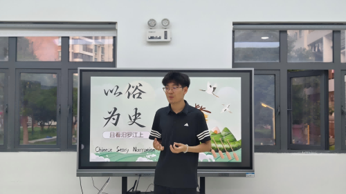 活动伊始,辅导员丁博老师以端午节习俗为切入点,结合考古文物与历史文献,向同学们介绍古越族“龙舟竞渡”与中原地区“投粽护魂”的文化关联。通过中英案例对比,阐释了端午节“习俗即史书”的内涵:“龙舟不仅是祭祀的载体,更是中华文化团结奋进的象征。双语叙事需融汇贯,让世界感知这份跨越千年的情感共鸣。”