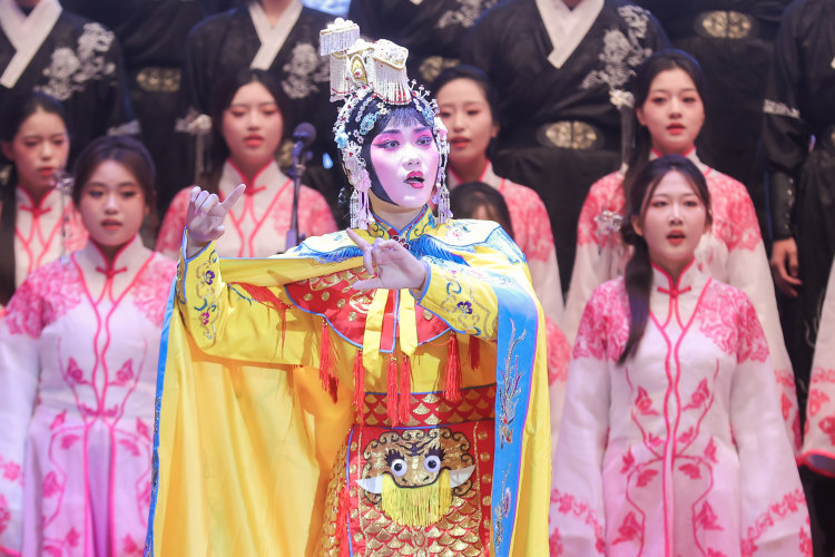 为了呈现最佳表演效果,管理学院合唱团的同学们付出了大量心血。从歌曲编排到声部磨合,从京剧身段训练到情感表达拿捏,大家利用课余时间反复打磨细节,克服了诸多挑战。指导老师全程悉心指导,从发声技巧、队形设计到服装道具搭配都严格把关,团队成员们相互鼓励、默契配合,在一次次排练中凝聚起强大的向心力。