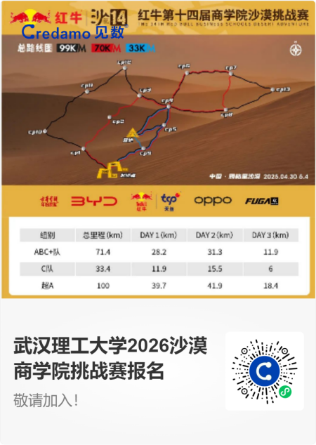2026年五一期间,武汉理工大学将首次组队,出征在腾格里沙漠举办的第十五届红牛商学院沙漠挑战赛(以下简称“沙赛”)!现面向全校MBA、MEM在校生及校友公开招募参赛队员,携手共赴这场融合勇气、协作与毅力的热血征程。